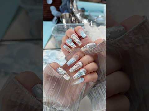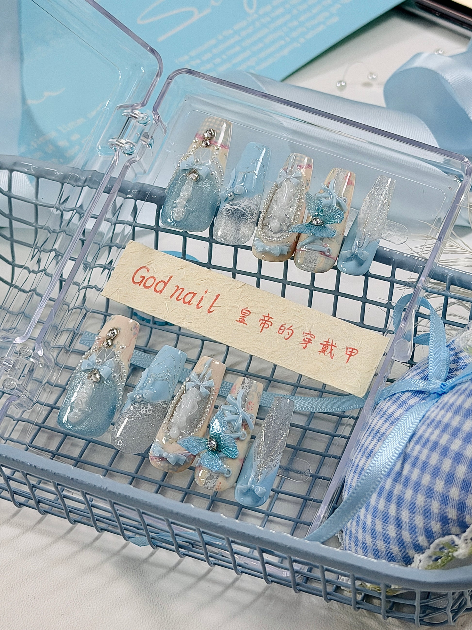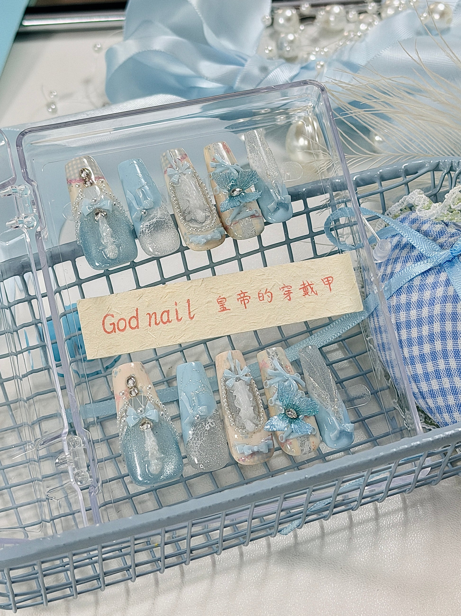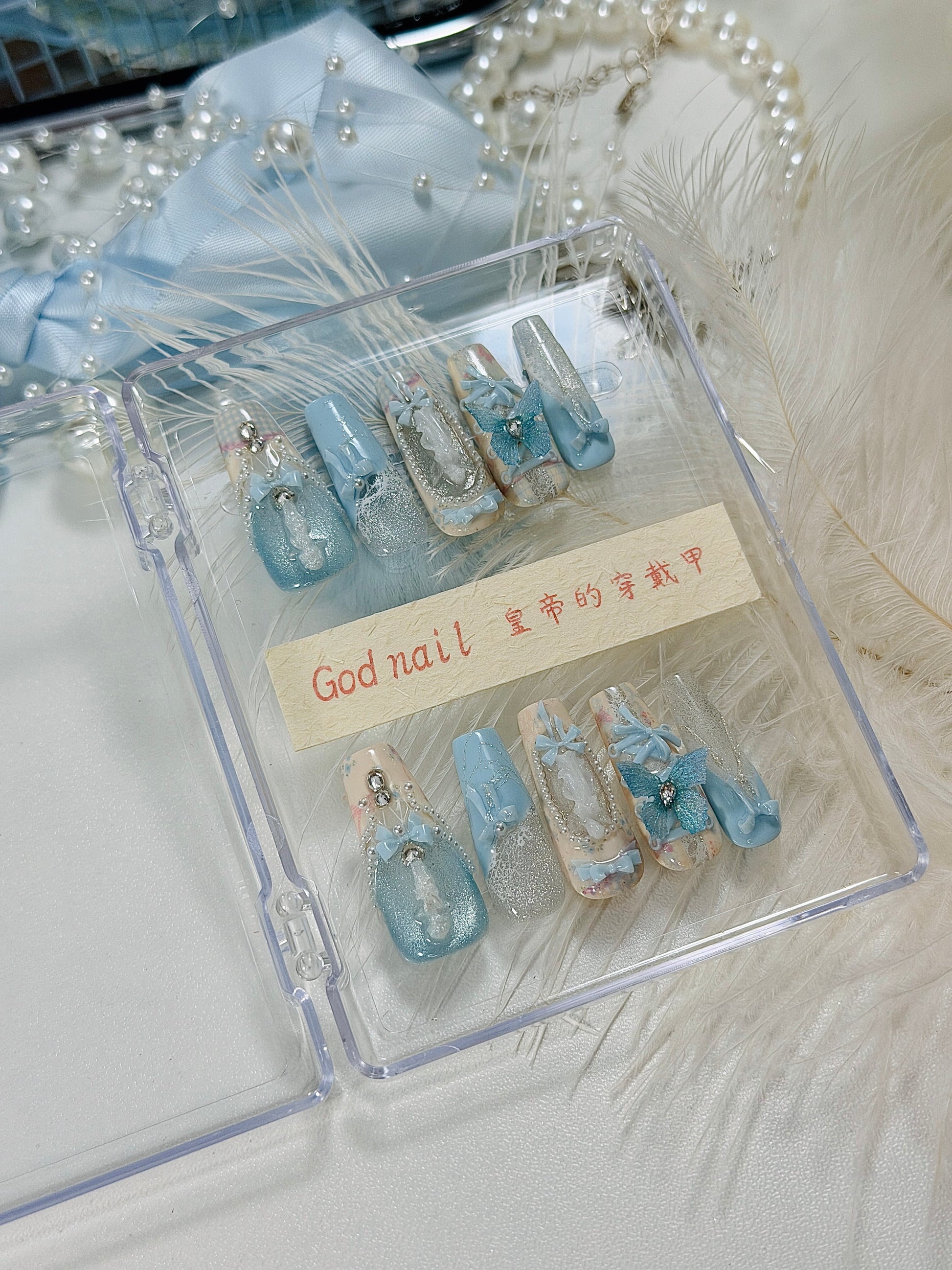 Blue Magnetic Butterfly Lace Press On Nails Long Coffin Pearl Beads Angel