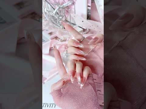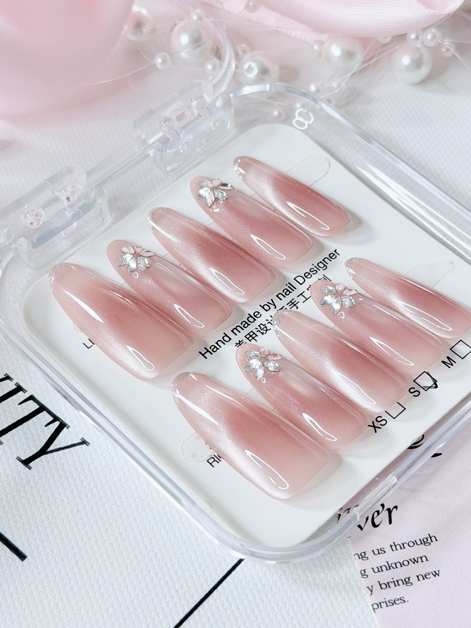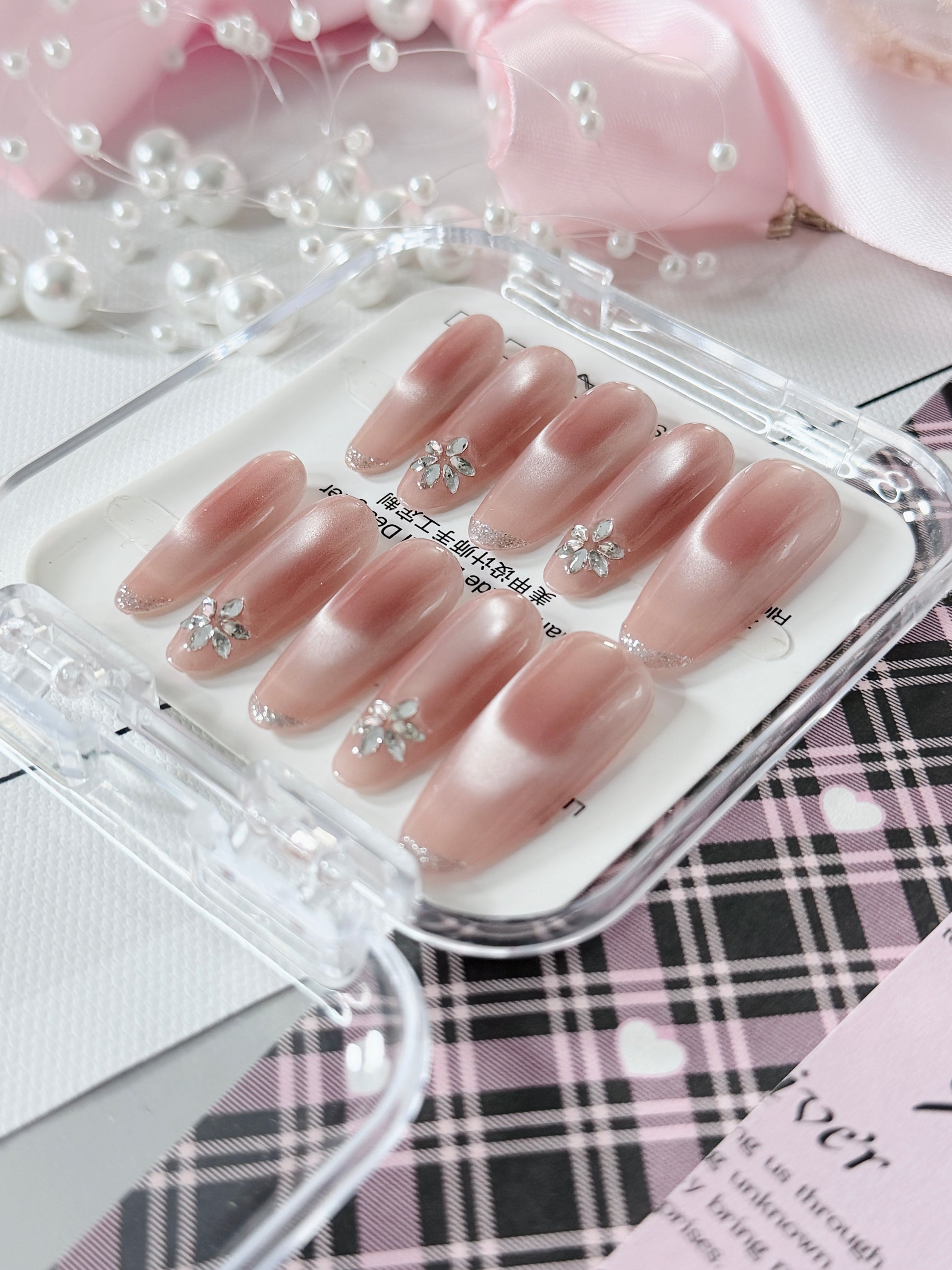 Elegant Long Press-On Nails Pearl Pink Diamond Shimmer Cat-Eye