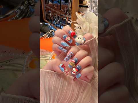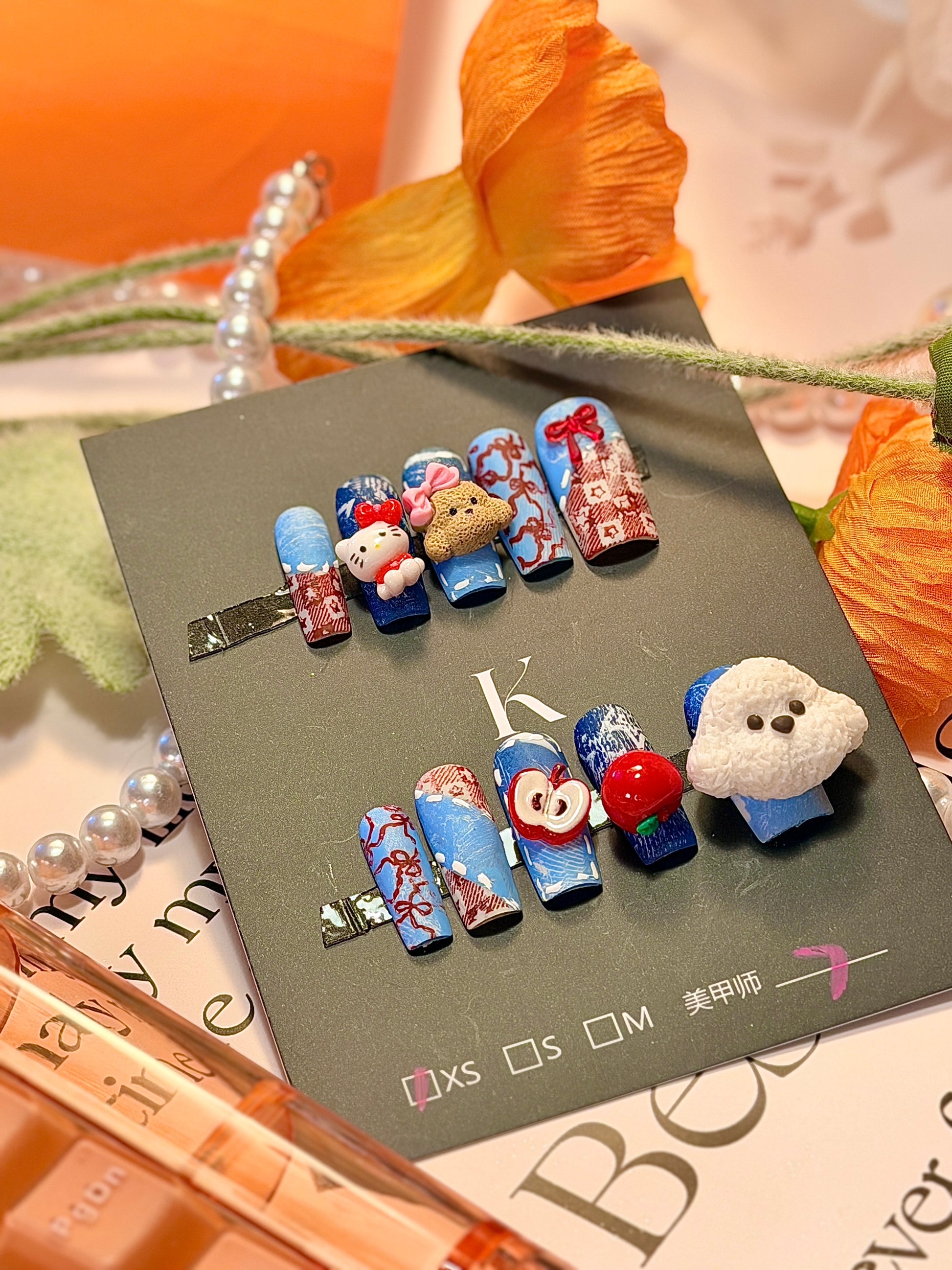 Kawaii Puppy Kitty 3D Red Apple Bow Denim Jeans Pattern Press On Nails Long Pipe