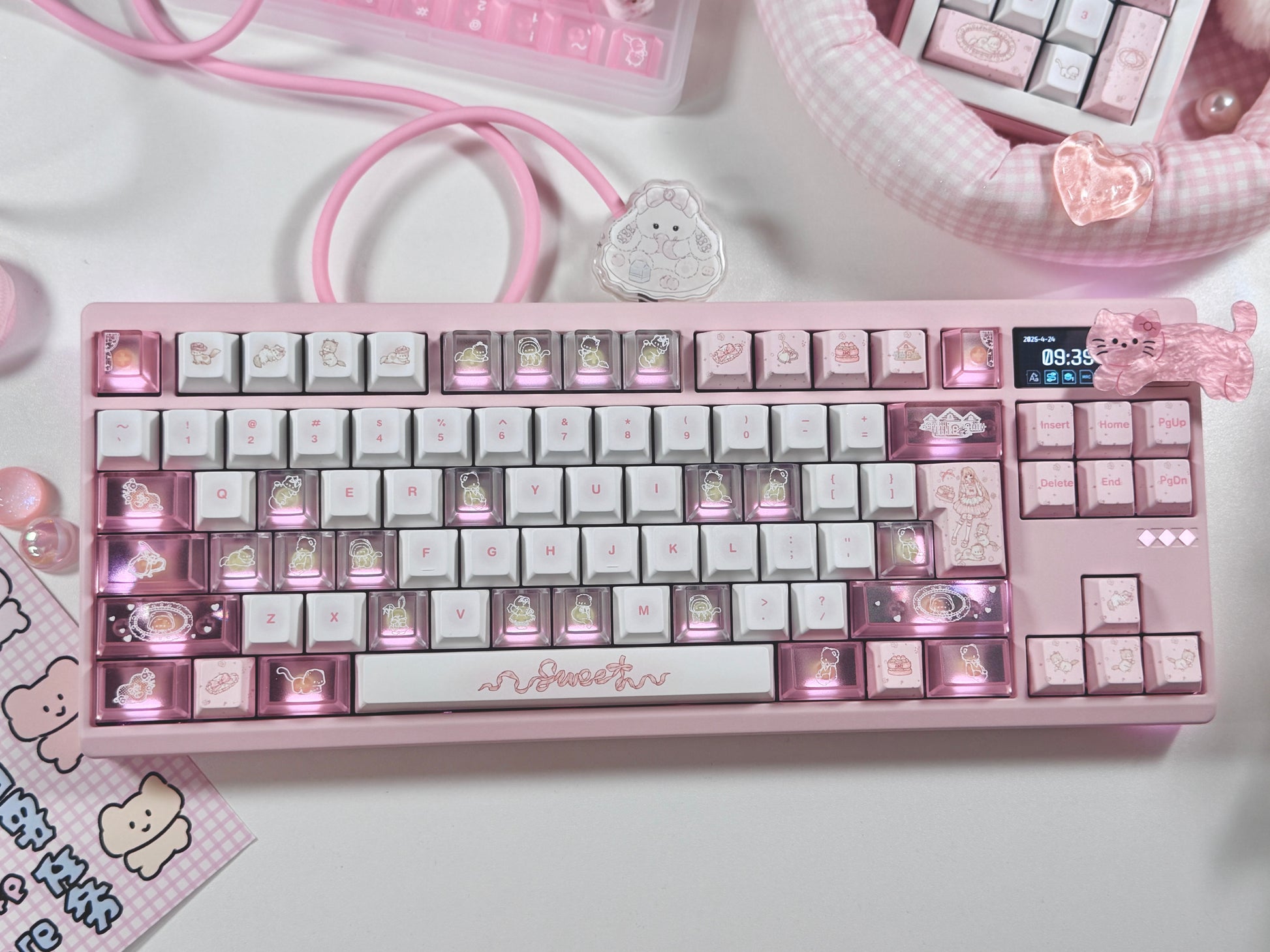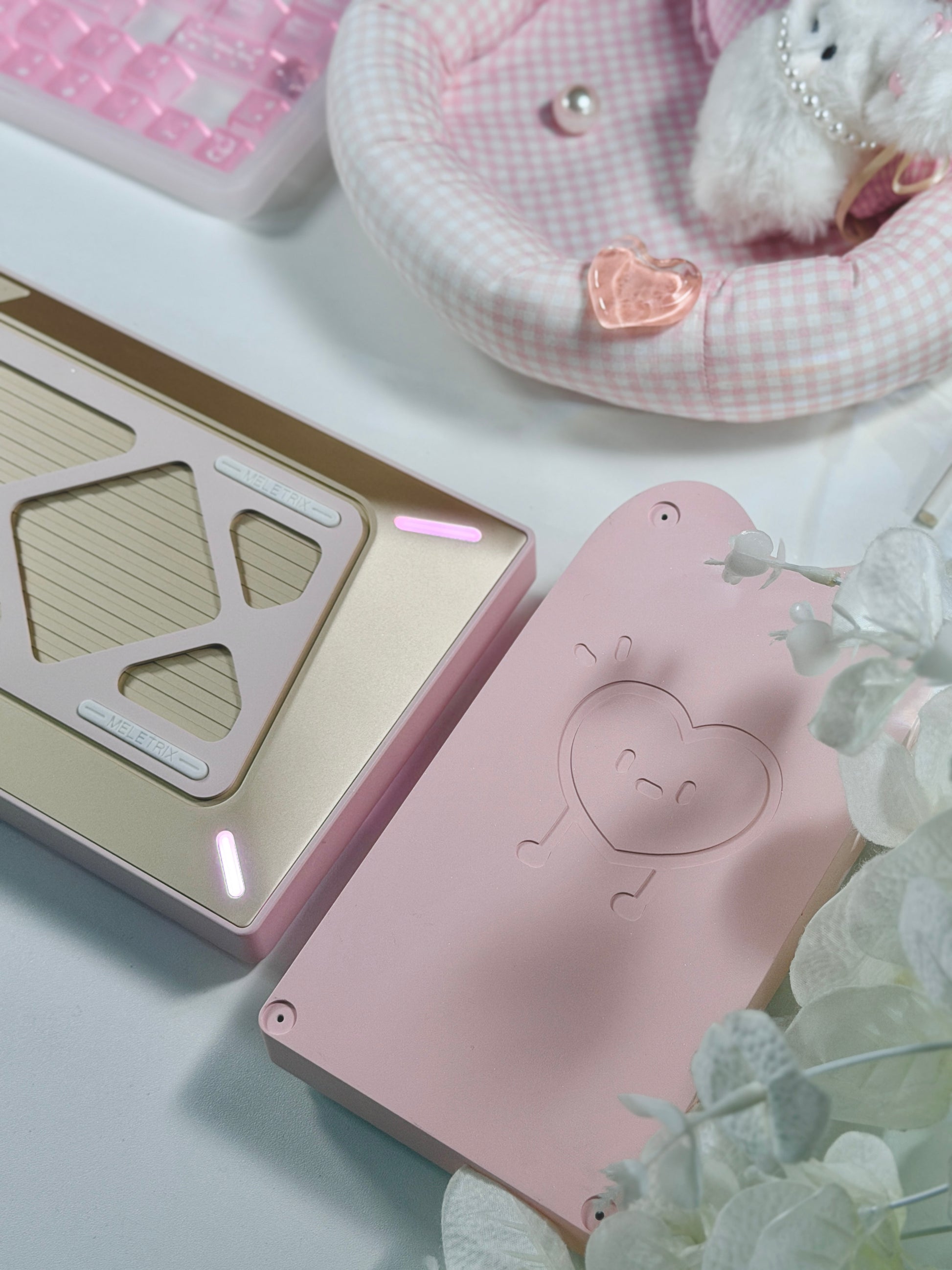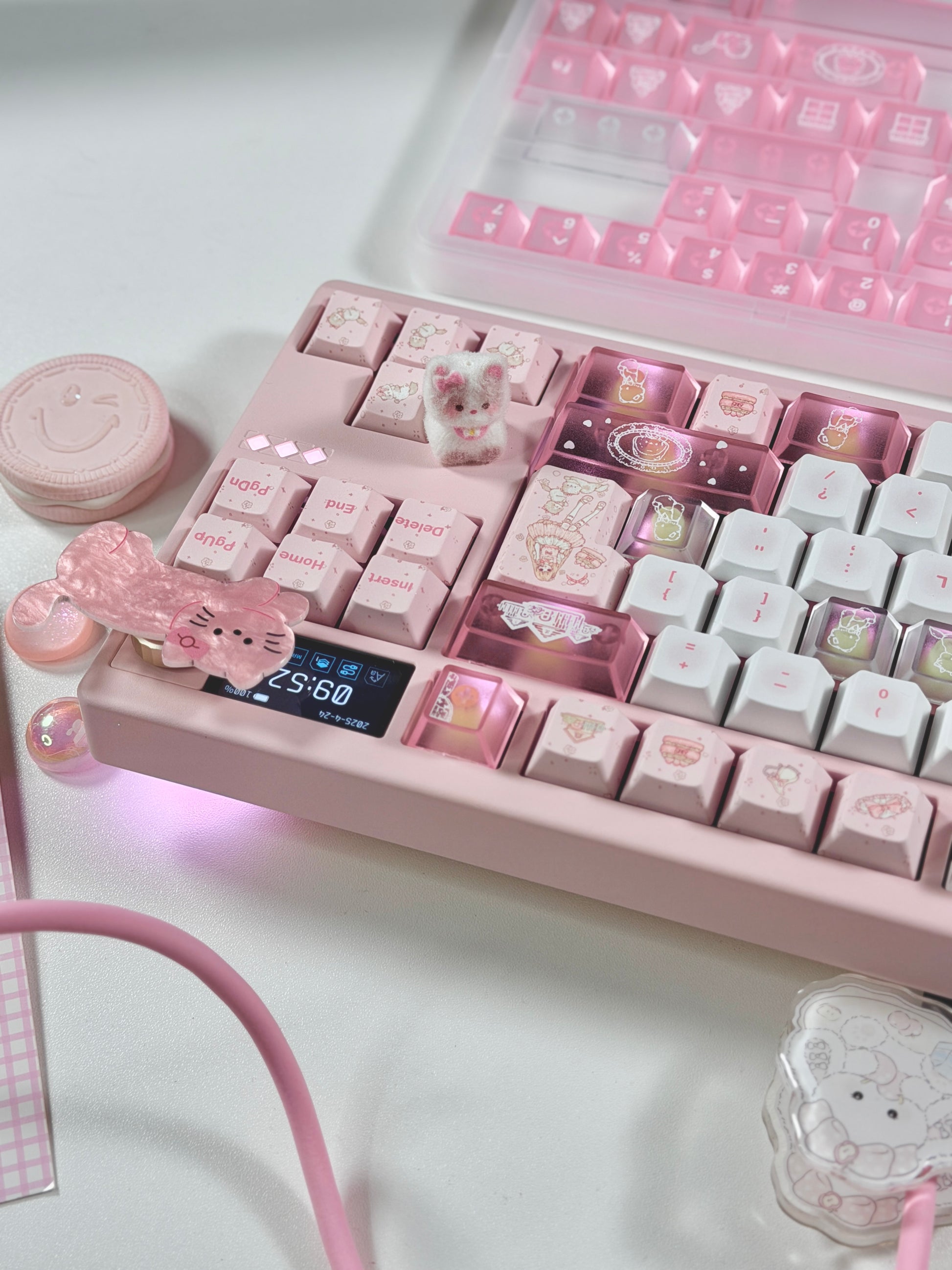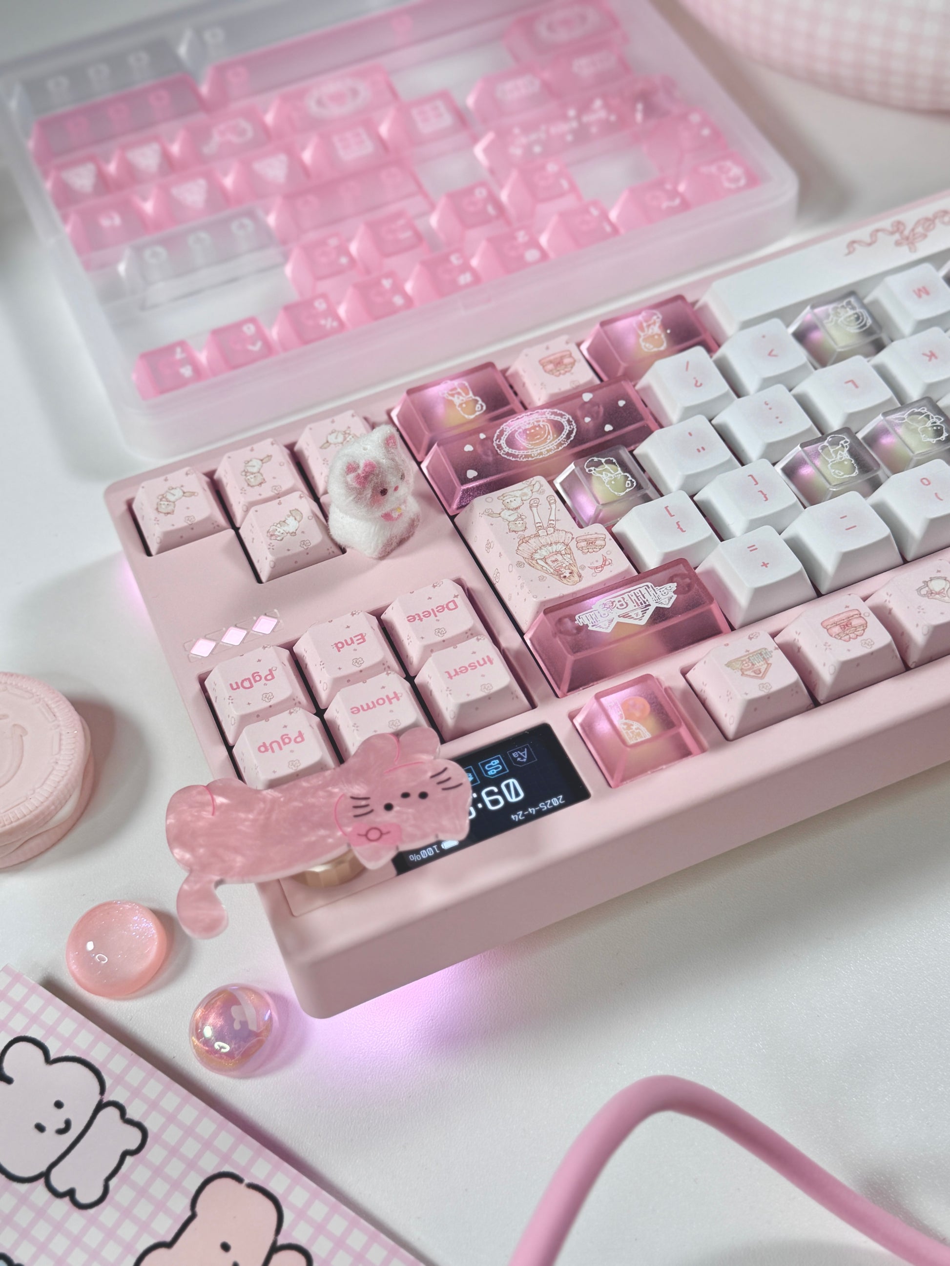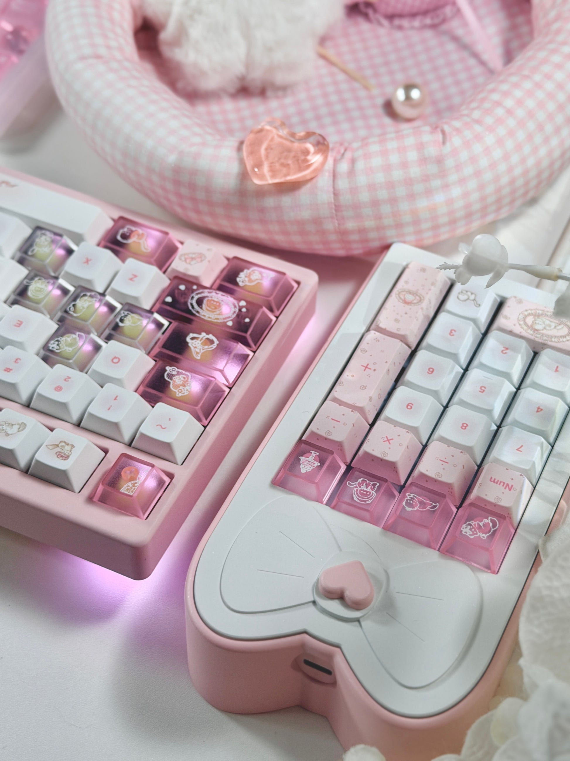 ONLY 1 Instock Prebuilt Aluminum Custom Mechanical Keyboard Pale Pink Meletrix ZOOM TKL DYNA Cat Keycap Set & Bow Pad