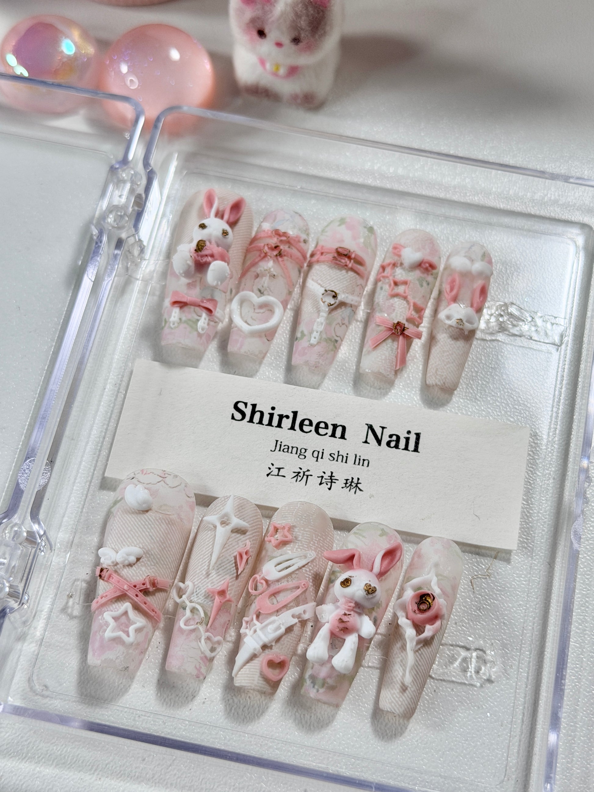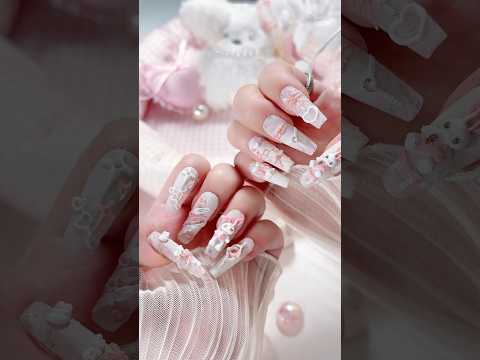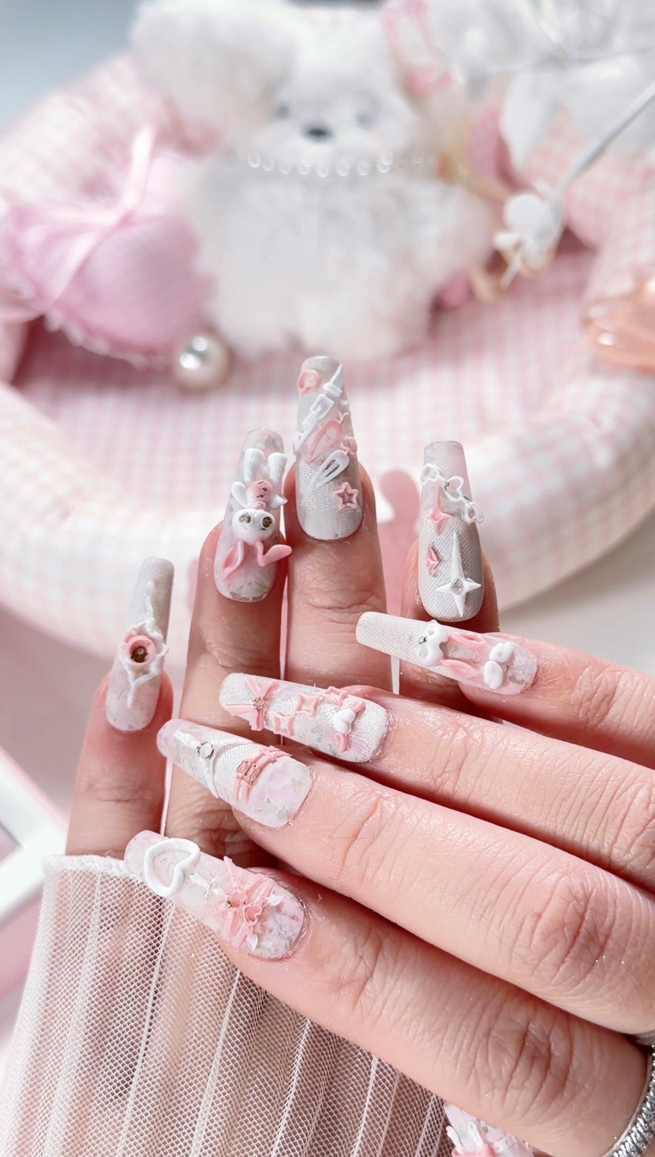 White Lace Pink Punk Bunny Bow 3D Pattern Press On Nails Long Coffin